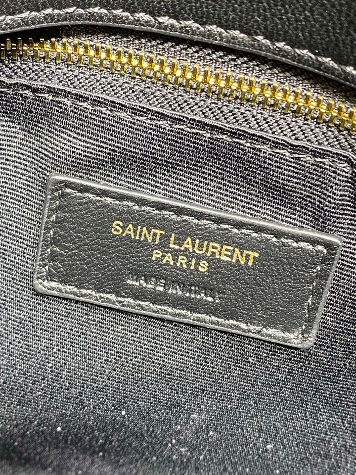 • Iconic metallic YSL logo detail at the front.