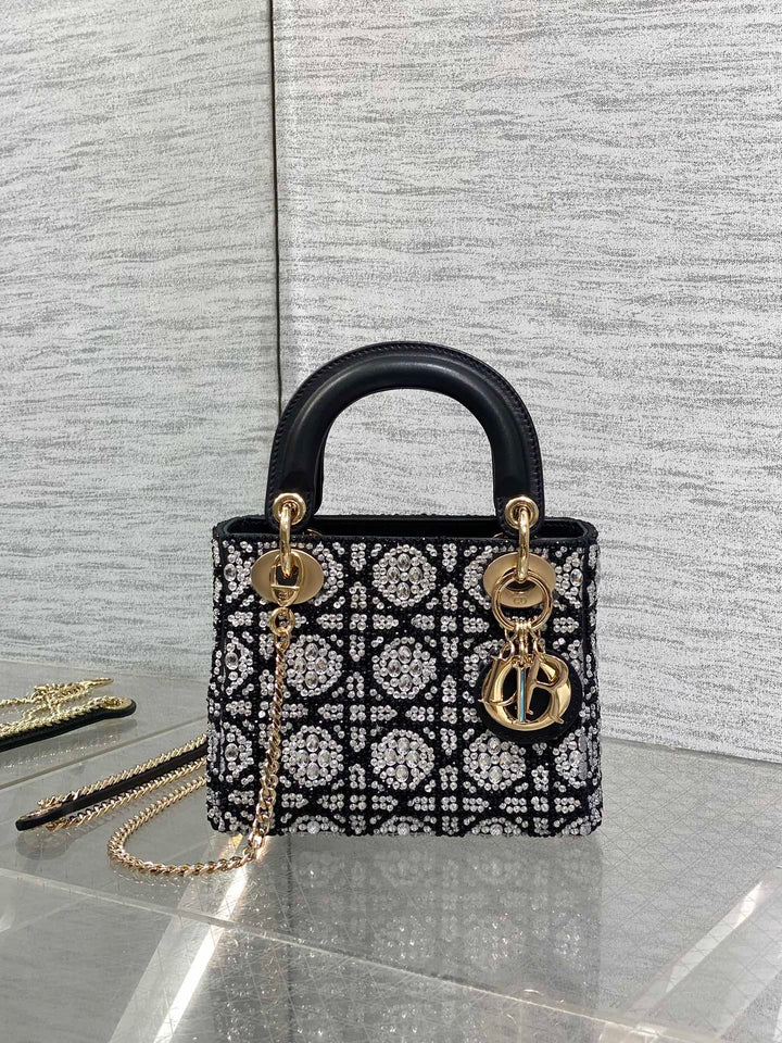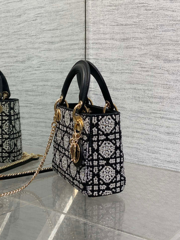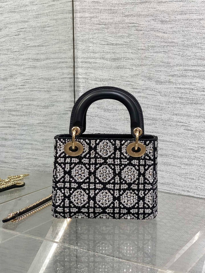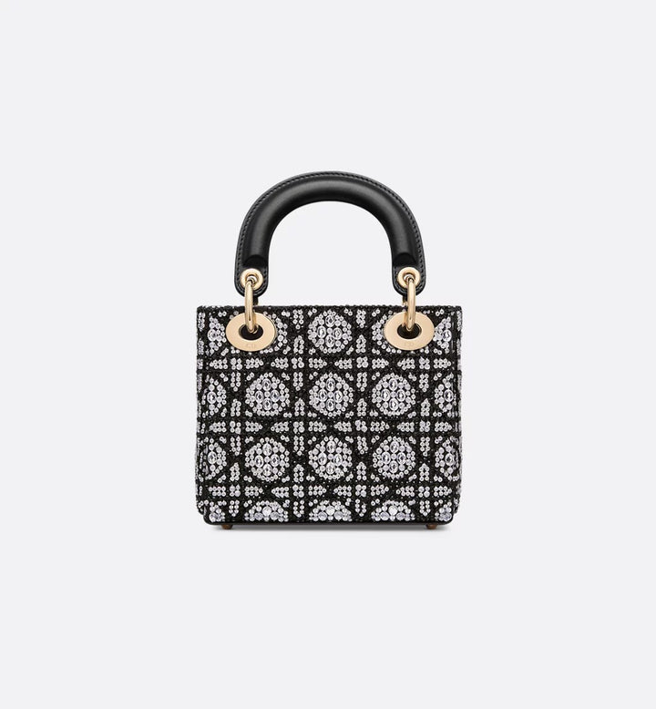 Mini Lady Dior Bag Embroidered with Black Beads and Silver Strass Elegant Luxury Design